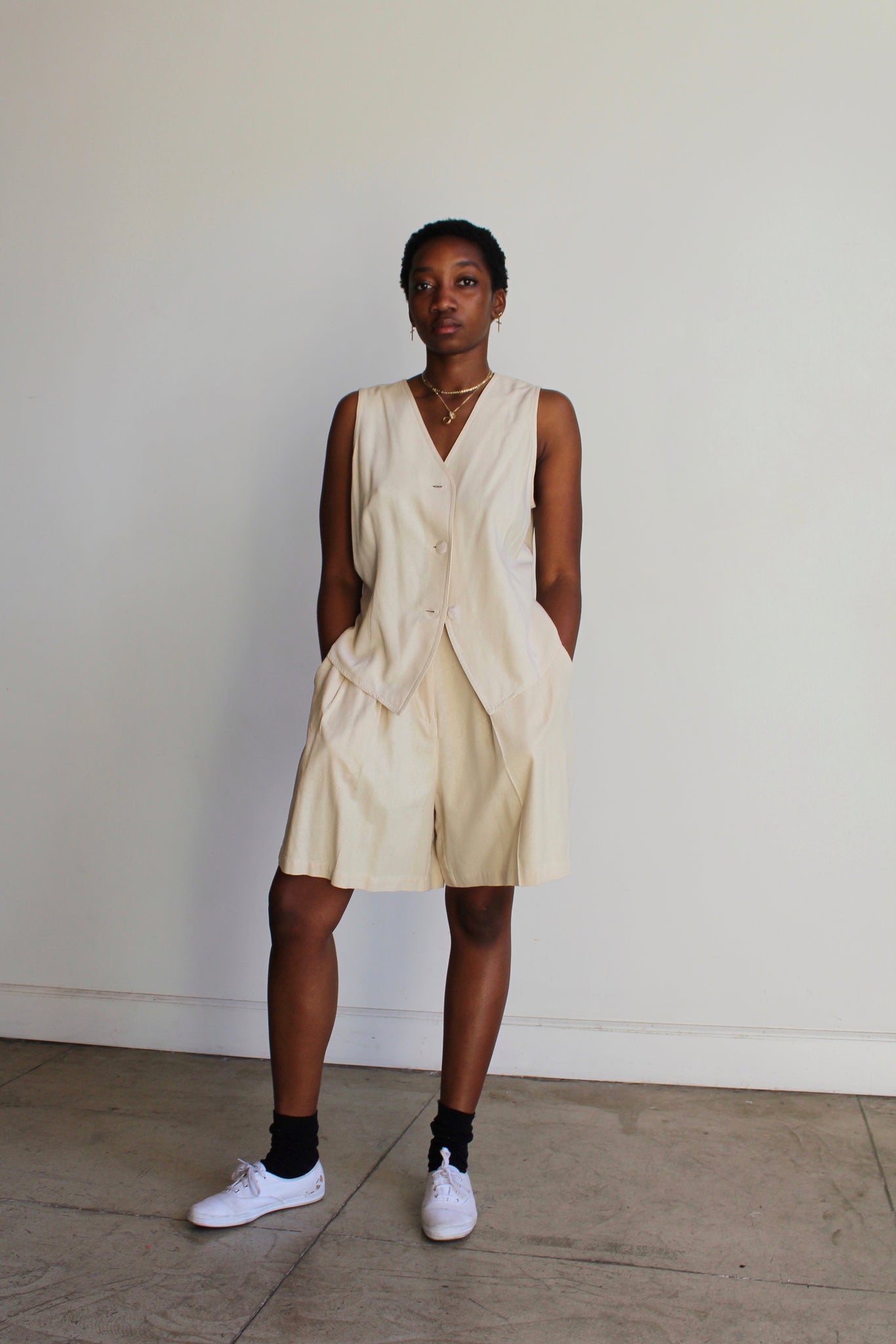 90s Silk Linen Nude Hued 2-Piece Vest + Shorts