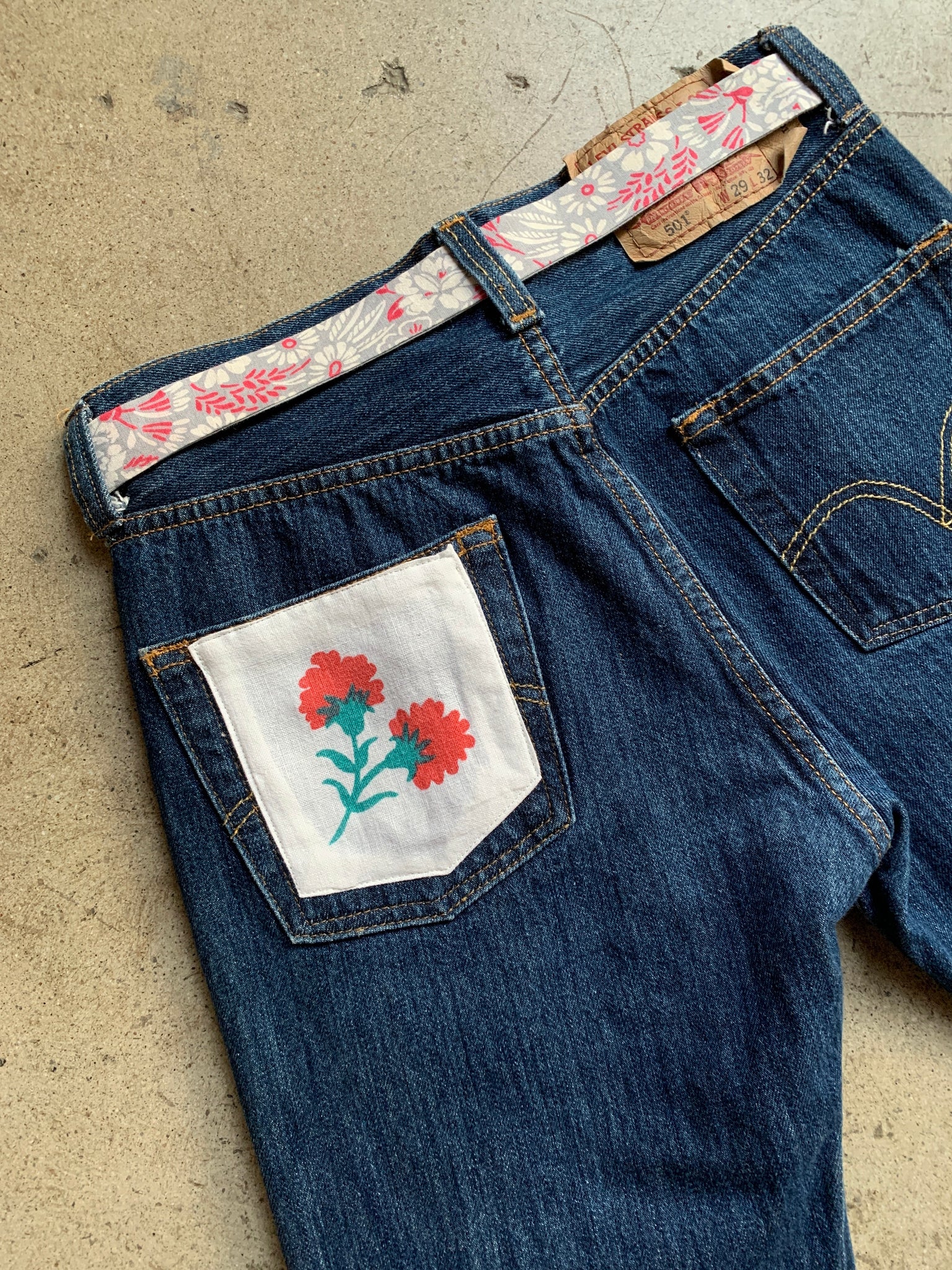 Vintage dark wash button-fly Levi's 501 with vintage patchwork and patchwork belt. The front features 1950s embroidered linens and colorful 1920s embroidery. The back features 1930s-1940s feed sack flower patch and a 1950s linen napkin with a printed flower on the back pocket. Belt is made with vintage gray bandana print fabric.