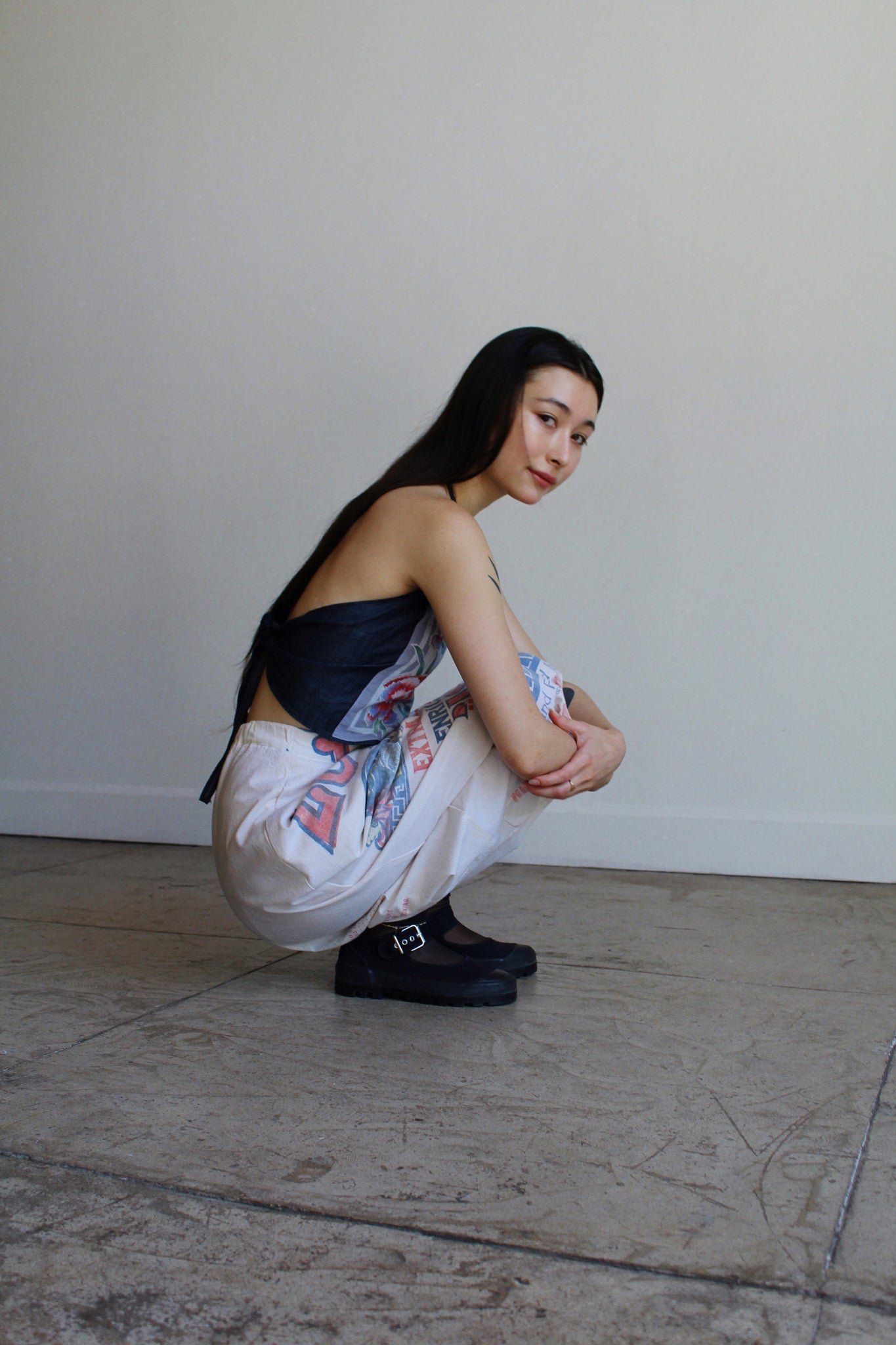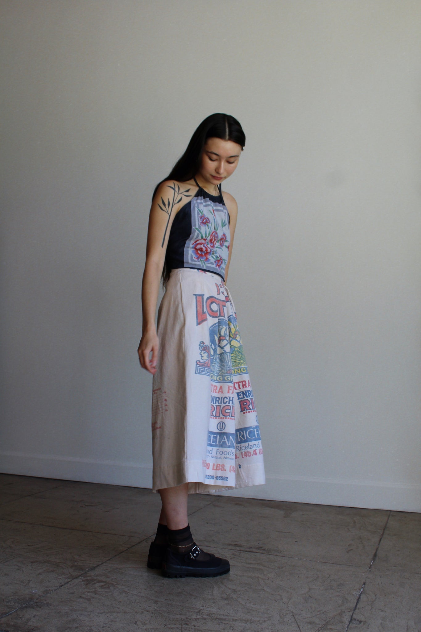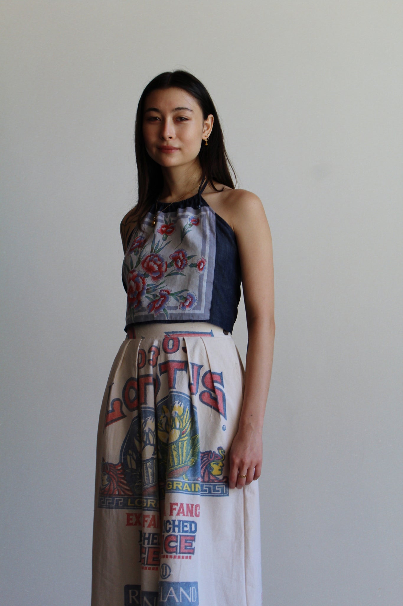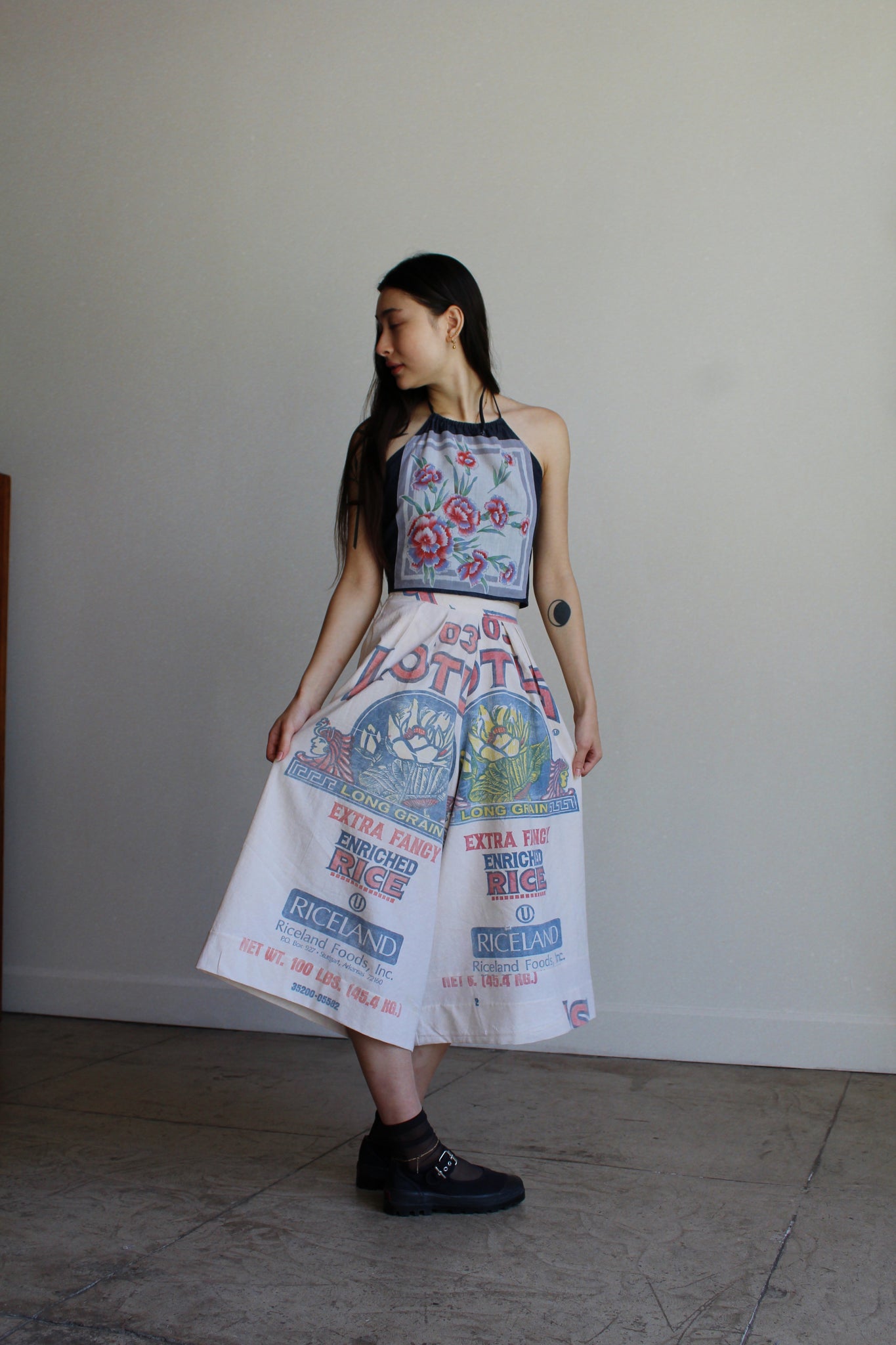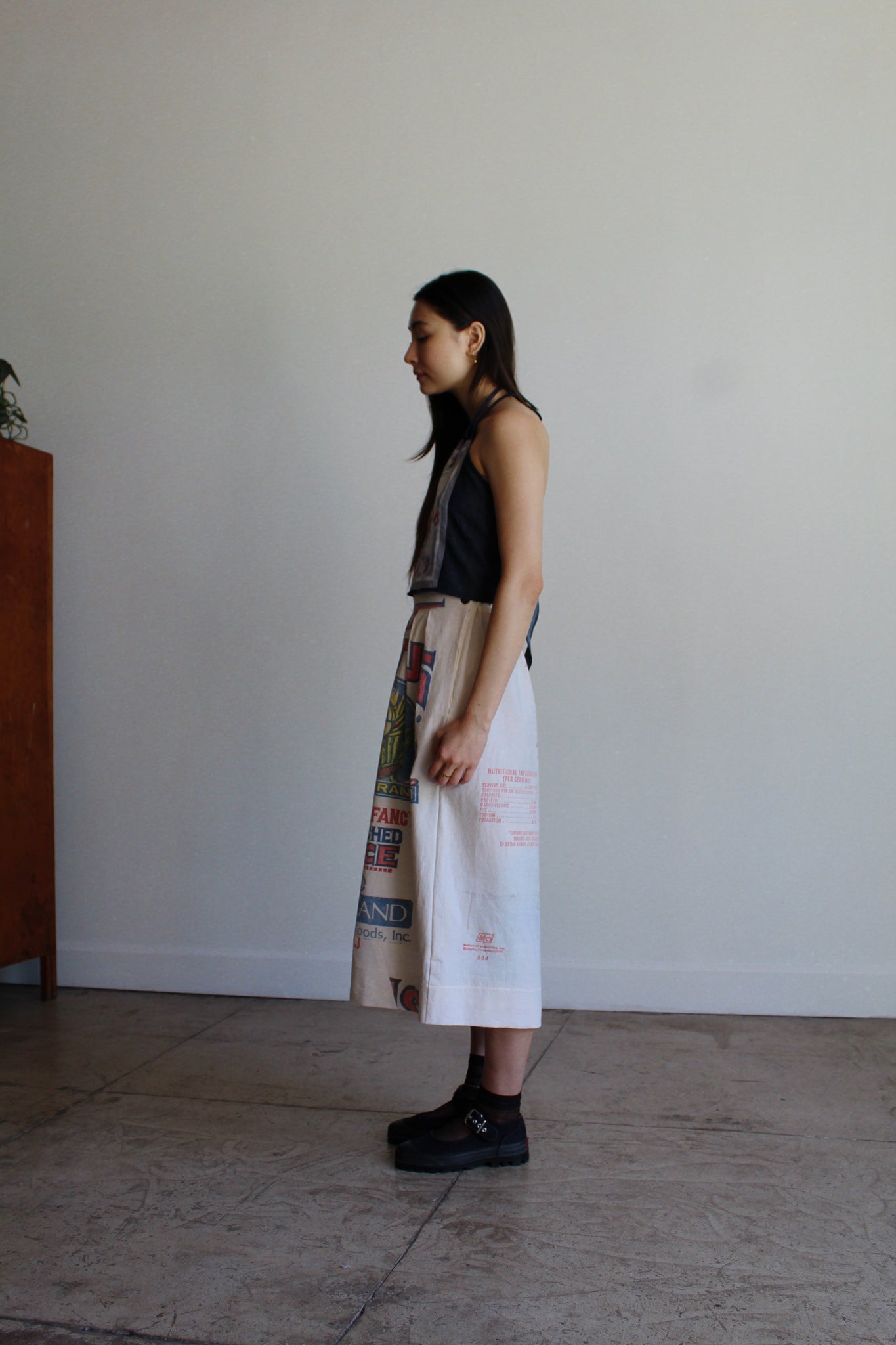 Lotus Rice Sack Culottes. High waist, wide leg pleated cropped pants with hidden side pockets. Side zip and coconut button closure. Elastic at back waist. Made from original 1950s-60s lotus print rice sacks.