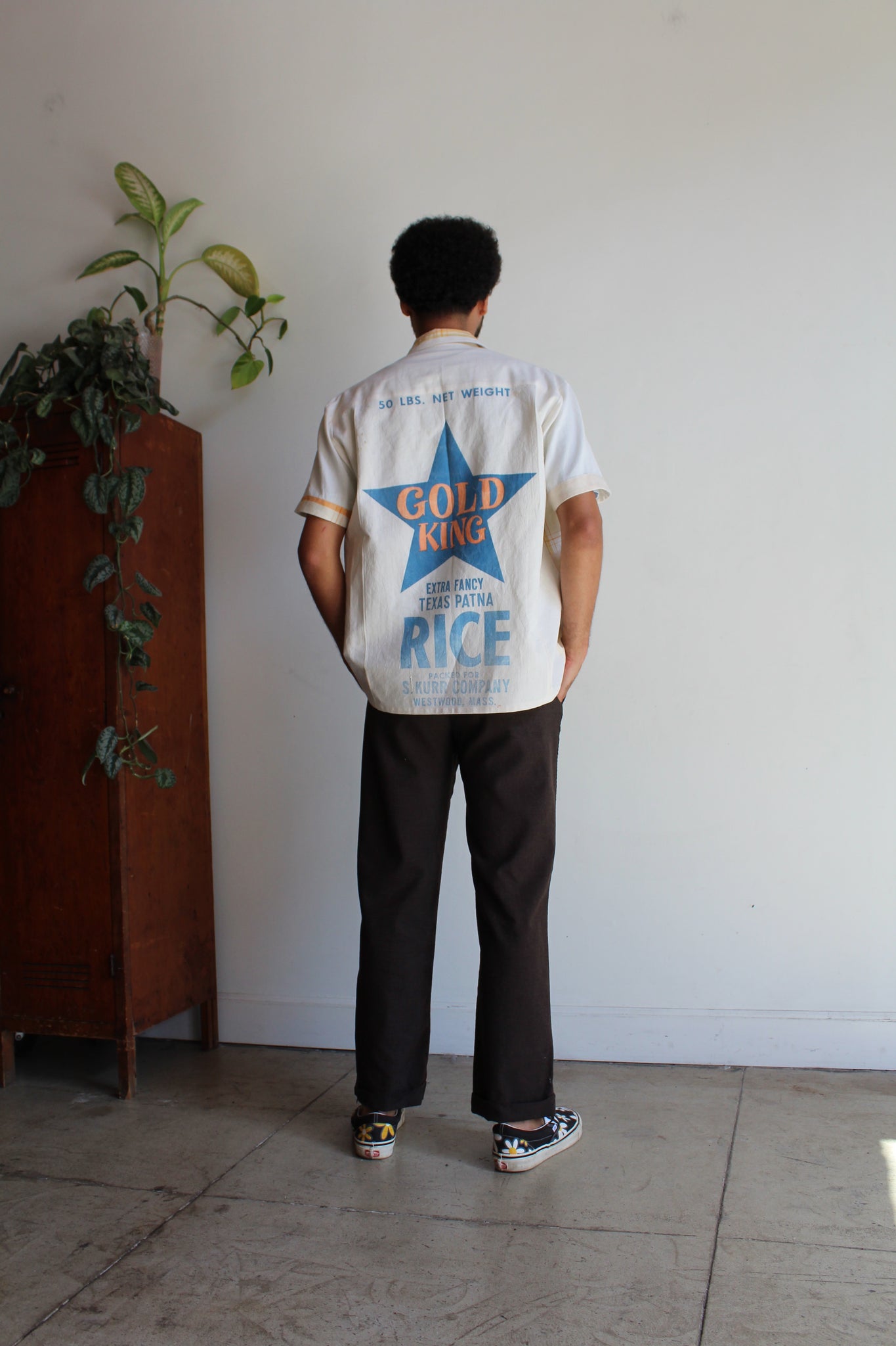 Email us with your measurements if you’re interested in a custom unisex button up top from our vintage rice/flour/feedsack selection.