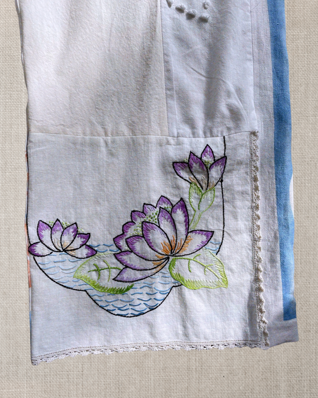 Patchwork crop top and pant set made from various vintage fabric remnants including 1940s chenille fabric, stunning 1930s stamp print linen tablecloth and vibrant 1930s lotus flower embroidered table runner with original hand crochet lace edging and black top stitching used for trim.